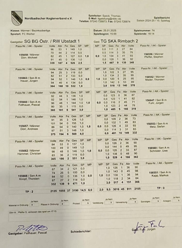 2024/2025 – 15. Spieltag – Andreas Dörr 569 und Christian Hammer 551 Kegel Beste Spieler beim Heimsieg über Rimbach