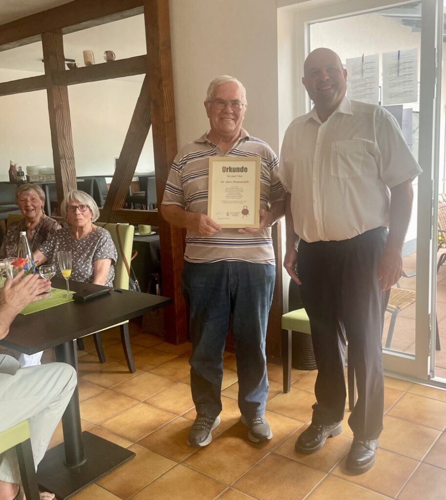 Unser Gründungsmitglied Adolf Pikal der uns schon Zeit 40 Jahre die Treue hält und uns auch immer wieder mal bei den Verbandsspielen besucht, wurde von Christian mit einer Urkunde für seine Treue zu den Blaugelben ausgezeichnet. Für alle Anwesende zauberte die Küche der Vereinsgaststätte unter Alexandra und Team ein Büffet in Top Form. Herzlichen Dank für die Verköstigung und Bewirtung.